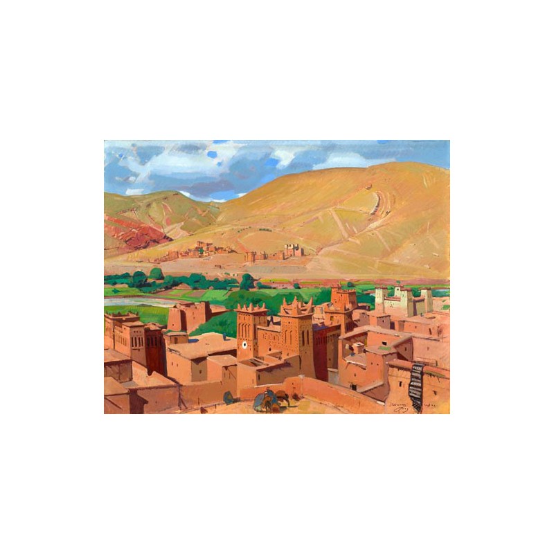 For nearly forty years, he tirelessly painted the different atmospheres of souks, scenes of everyday life and the unique beauty of the models who came to pose at his home. His numerous trips to the kasbahs of the Atlas Mountains and other cities in Morocco enabled him to capture the richness of the landscapes, architecture, markets and ceremonies he was privileged to witness.