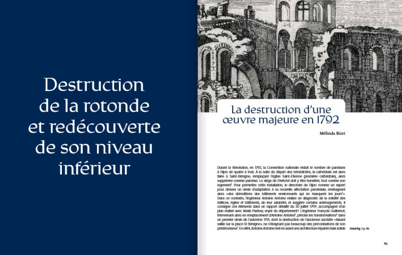 Accompagnée de recherches archéologiques, elle a permis un renouvellement des connaissances sur la rotonde, qui sont présentées dans l’exposition La Rotonde de Saint-Bénigne, 1 000 ans d’histoire et font l’objet de ce catalogue. Celui-ci permettra au visiteur de découvrir les différents aspects de cette construction : le contexte de sa création, son architecture, sa signification liturgique, les raisons de sa destruction, la découverte des vestiges de son premier niveau au XIXe siècle, ainsi que les fouilles et les restaurations successives dont elle a fait l’objet.